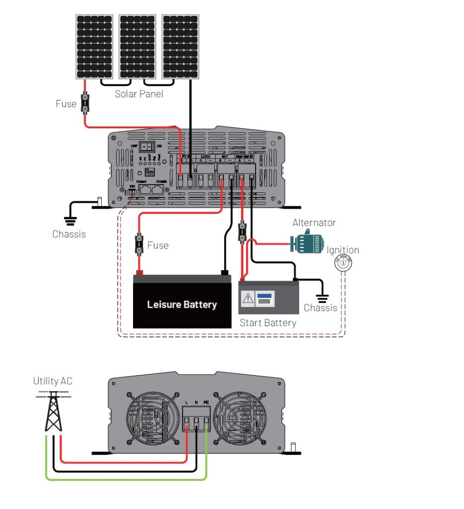 S kombinacijo 50A polnilnika baterija-baterija (DC-DC), 50A polnilnika na omrežno napajanje in 30A solarne krmilne enote omogoča polnjenje iz alternatorja vozila med vožnjo, iz omrežnega napajanja na kampih ter iz sončnih panelov, ko sije sonce.